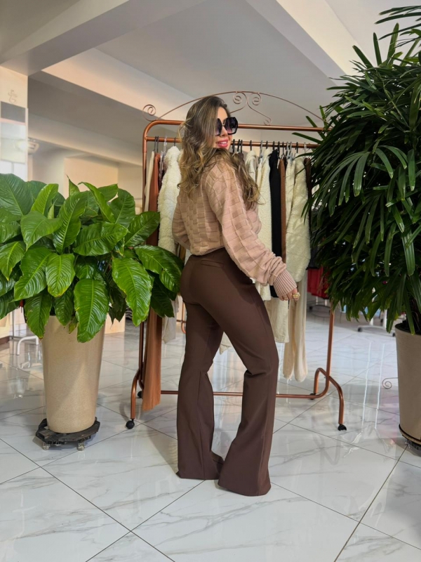 O caimento é impecável: ajustada na parte superior e com abertura flare na barra, criando um efeito alongador imediato nas pernas. O detalhe do friso frontal acompanha todo o comprimento da peça, reforçando ainda mais essa sensação de alongamento e elegância.