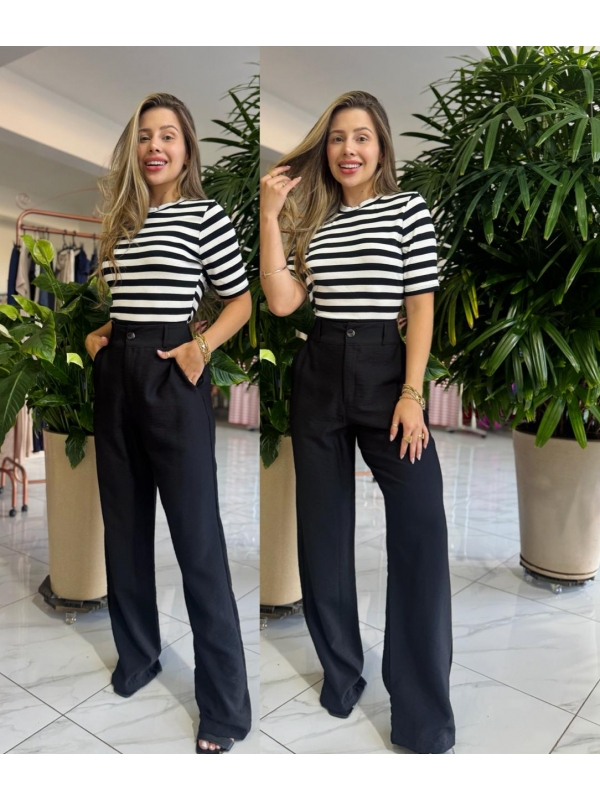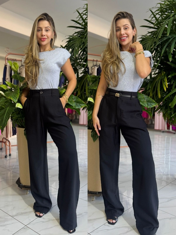 Calça feminina pantalona surface, confeccionada em tecido de alta qualidade que proporciona excelente caimento e conforto ao vestir. Possui cintura alta, cós estruturado com passantes para cinto e bolsos laterais funcionais, garantindo praticidade e sofisticação. A modelagem de pernas amplas alonga a silhueta e traz elegância ao visual, sendo ideal para composições que vão do look profissional ao casual elegante. Uma peça versátil, atemporal e indispensável no guarda-roupa feminino.