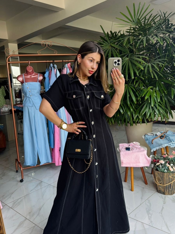 Possui modelagem longa, fechamento frontal por botões funcionais, mangas curtas e bolsos frontais, unindo estilo e praticidade. O caimento impecável alonga o corpo e permite produções versáteis — do trabalho a eventos casuais mais elegantes.