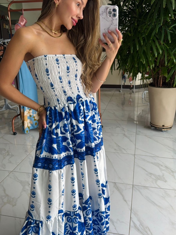 Vestido longo Mavie é um tomara-que-caia, com uma proposta leve e elegante, perfeito para dias quentes ou ocasiões ao ar livre.